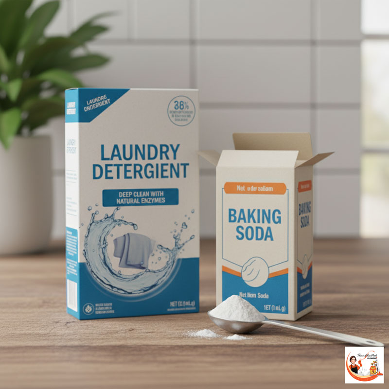 เหมาะกับคราบทั่วไป กลิ่นไม่แรง ใช้ผงซักฟอกผสมเบกกิ้งโซดาเข้าด้วยกัน และนำไปป้ายบริเวณที่เกิดราดำตามร่องยาแนว ทิ้งไว้ประมาณ 5-10 นาที โดยระหว่างที่ทำอย่าลืมเปิดประตู หน้าต่างเพื่อทำการระบายอากาศ จากนั้นใช้แปรงขัดให้สะอาด ทิ้งไว้ประมาณ 10 นาที และใช้น้ำล้างตามด้วยผ้าเช็ดออกให้สะอาด